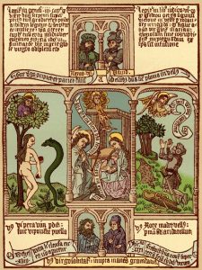 The invention of the Biblia Pauperum, or Bible of the Poor, is ascribed to St. Ansgar, Archbishop of Hamburg-Bremen. These small books were at first made by hand consisting in illustrations of the New Testament accompanied by a corresponding prophetic type from the Old Testament, e.g., an image of the Annunciation, where the Angel visited Mary, would have next to it one of the fall of man when the serpent tempted Eve (right). Sometimes a brief text was included and the words spoken by the figures were written on scrolls coming out of their mouths (as in today’s comic books). We must not confuse the name “Bible of the poor,” with the term “Poor Man’s Bible” which is used to describe the works of art in the churches, such as stained glass windows, paintings, statues, mosaics, etc., illustrating scriptural passages. However, the idea in both was the same: To use images to evangelise the poor, or rather, the illiterate population.